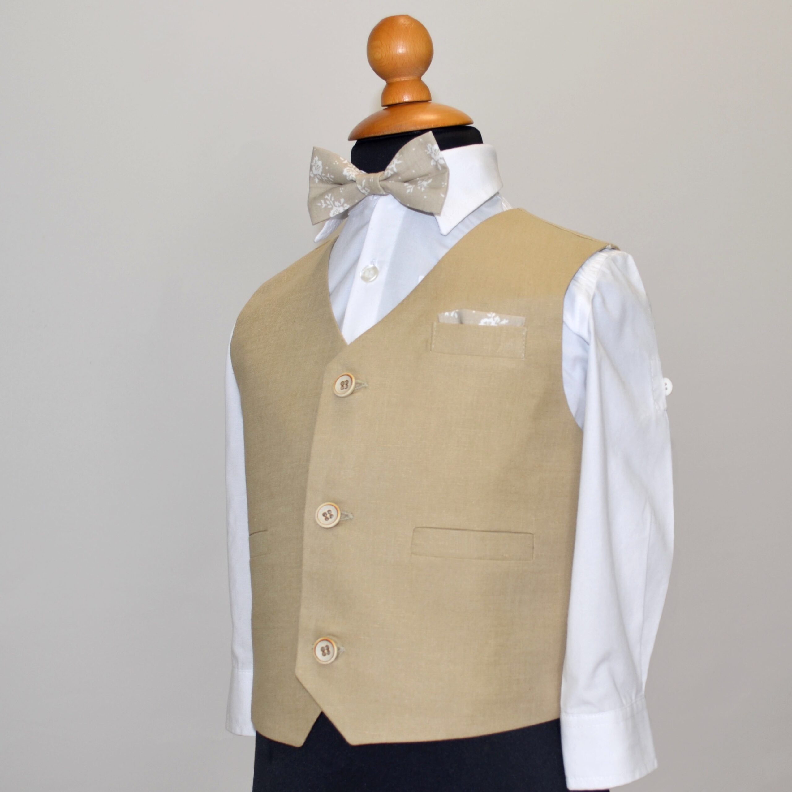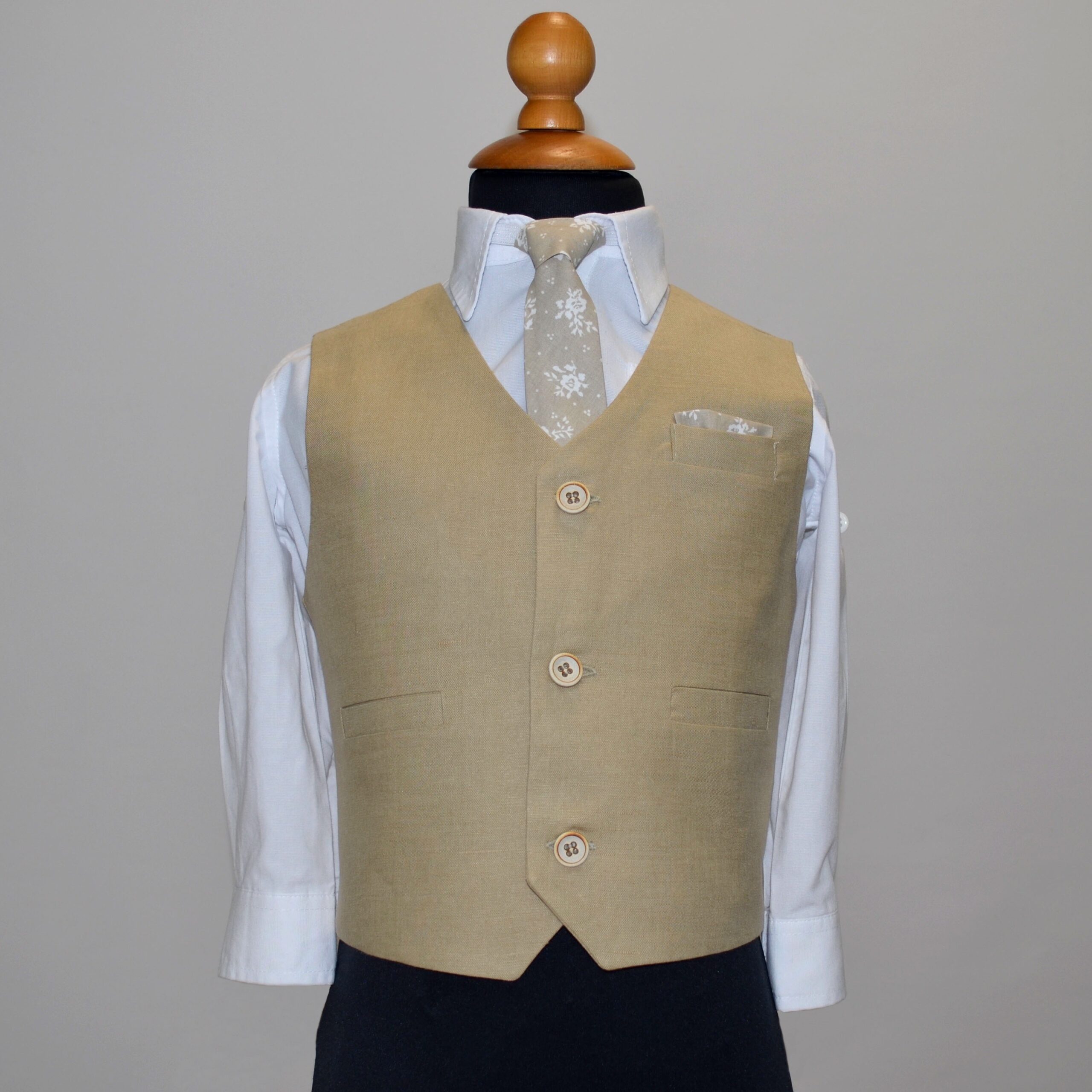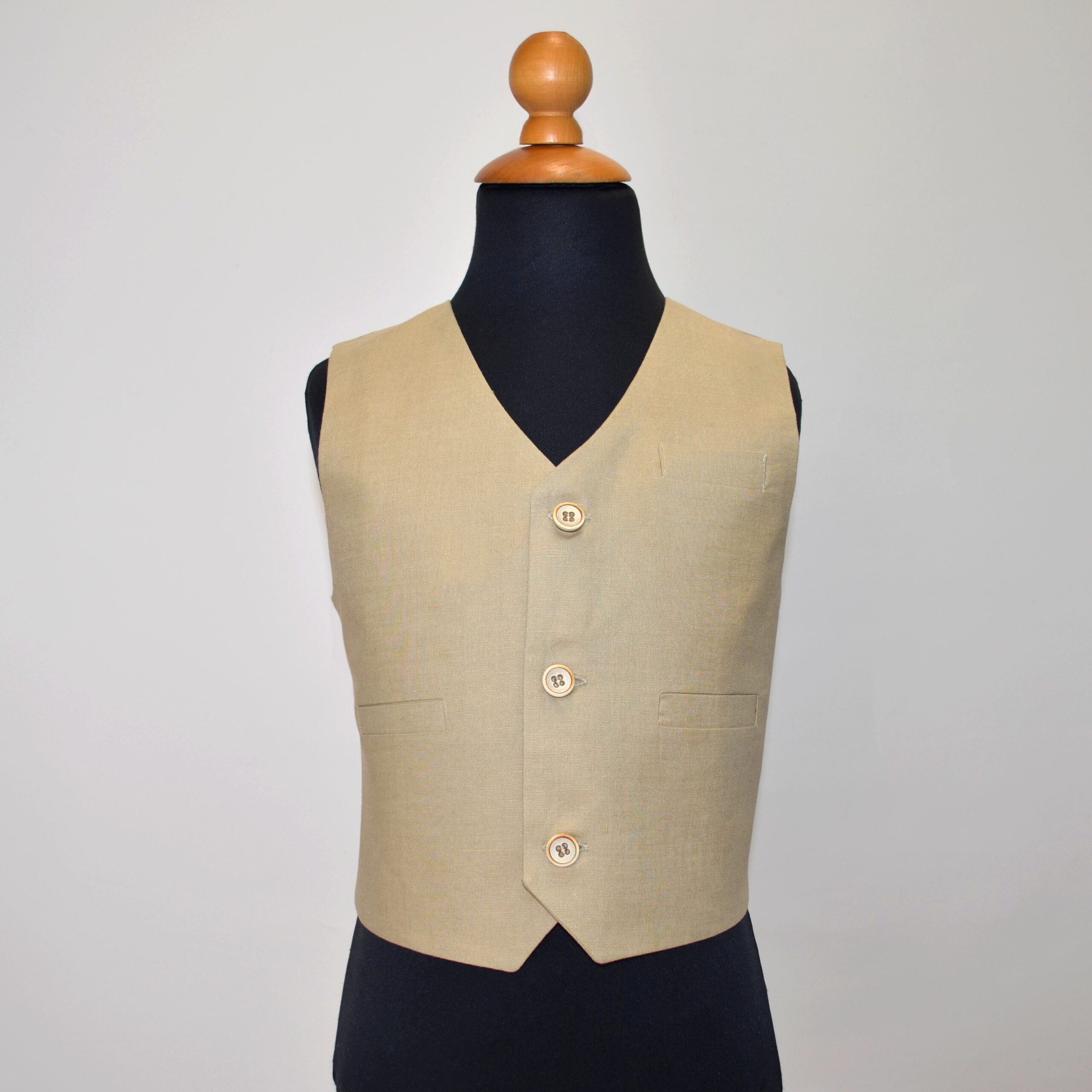 Χειροποίητο μονόχρωμο λινό γιλέκο σε μπεζ απόχρωση και τσέπες φιλέτο. Τσέπη στο πέτο για μαντιλάκι. Βαμβακερή εμπριμέ φόδρα στην ίδια απόχρωση. Μπορεί να συνδυαστεί με το ανάλογο παπιγιόν ή γραβάτα. Ζωνάκι στο πίσω μέρος που αυξομειώνει.