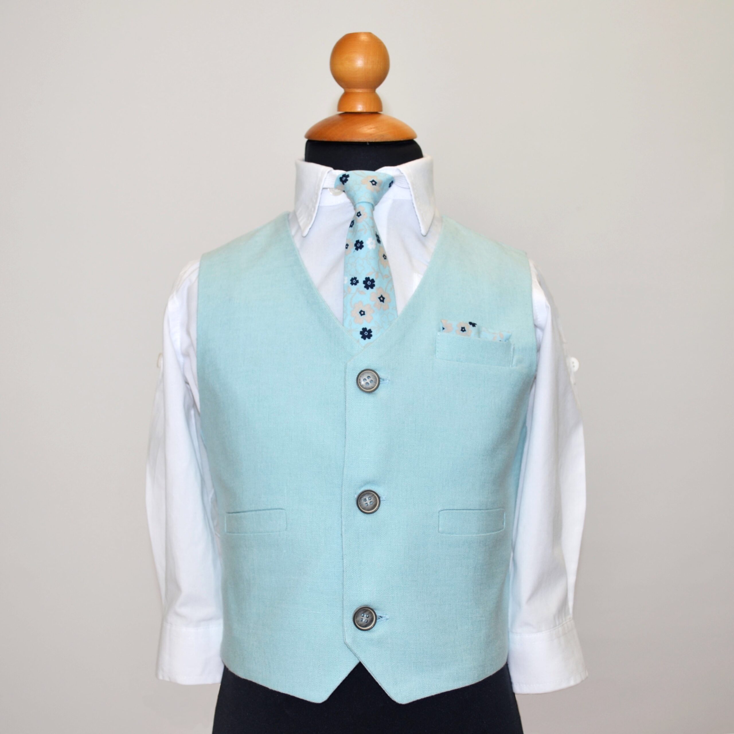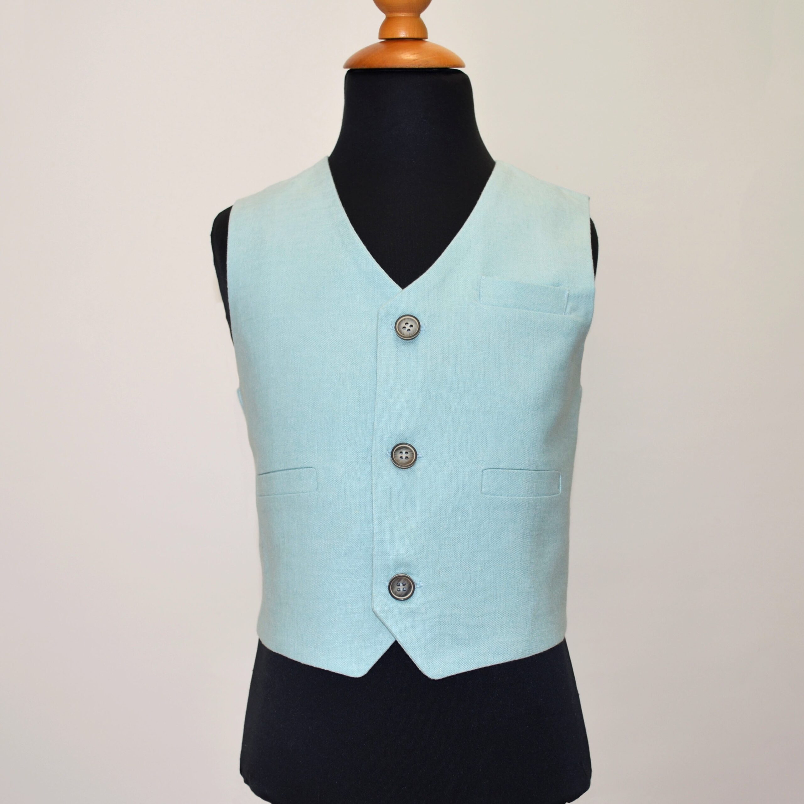Λινό μονόχρωμο γιλέκο σε σιέλ απόχρωση και τσέπες φιλέτο. Τσέπη στο πέτο για μαντιλάκι. Βαμβακερή εμπριμέ φόδρα στην ίδια απόχρωση. Μπορεί να συνδυαστεί με το ανάλογο παπιγιόν ή γραβάτα. Ζωνάκι στο πίσω μέρος που αυξομειώνει.