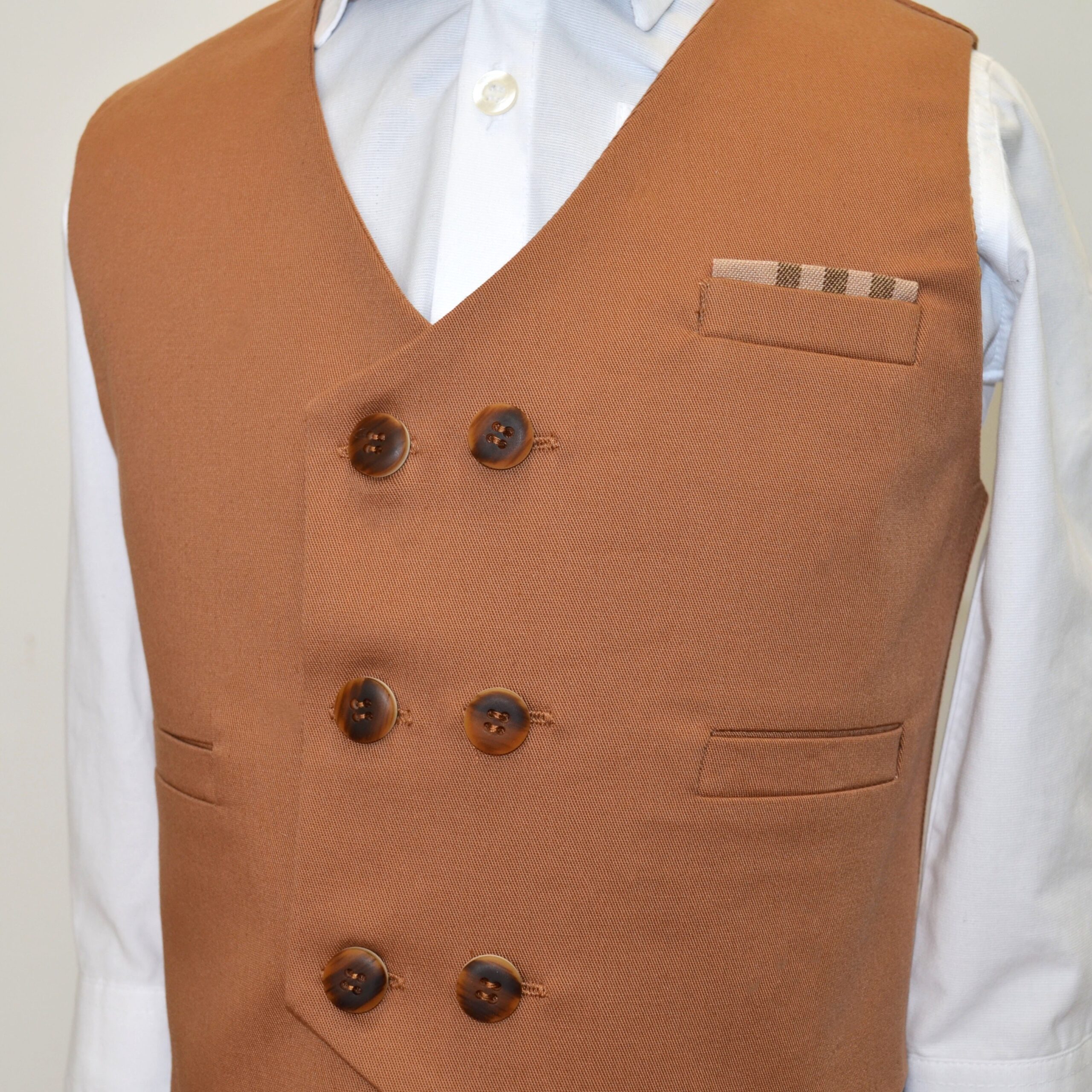 Γιλέκο σταυροκουμπωμα με λεπτομέρειες , τσέπες φιλέτο και μαντηλάκι στο πέτο. Η δεύτερη σειρά είναι διακοσμητική , ώστε να μην δυσκολεύει τους μικρούς κυρίους .100% βαμβακερό. ύφασμα καπαρντίνα εξωτερικά και φόδρα από ποπλίνα σε διάφορα σχέδια, ώστε να είναι φιλικό και άνετο στο σώμα. Σε διάφορα χρώματα . Ζωνάκι στο πίσω μέρος που αυξομειώνει