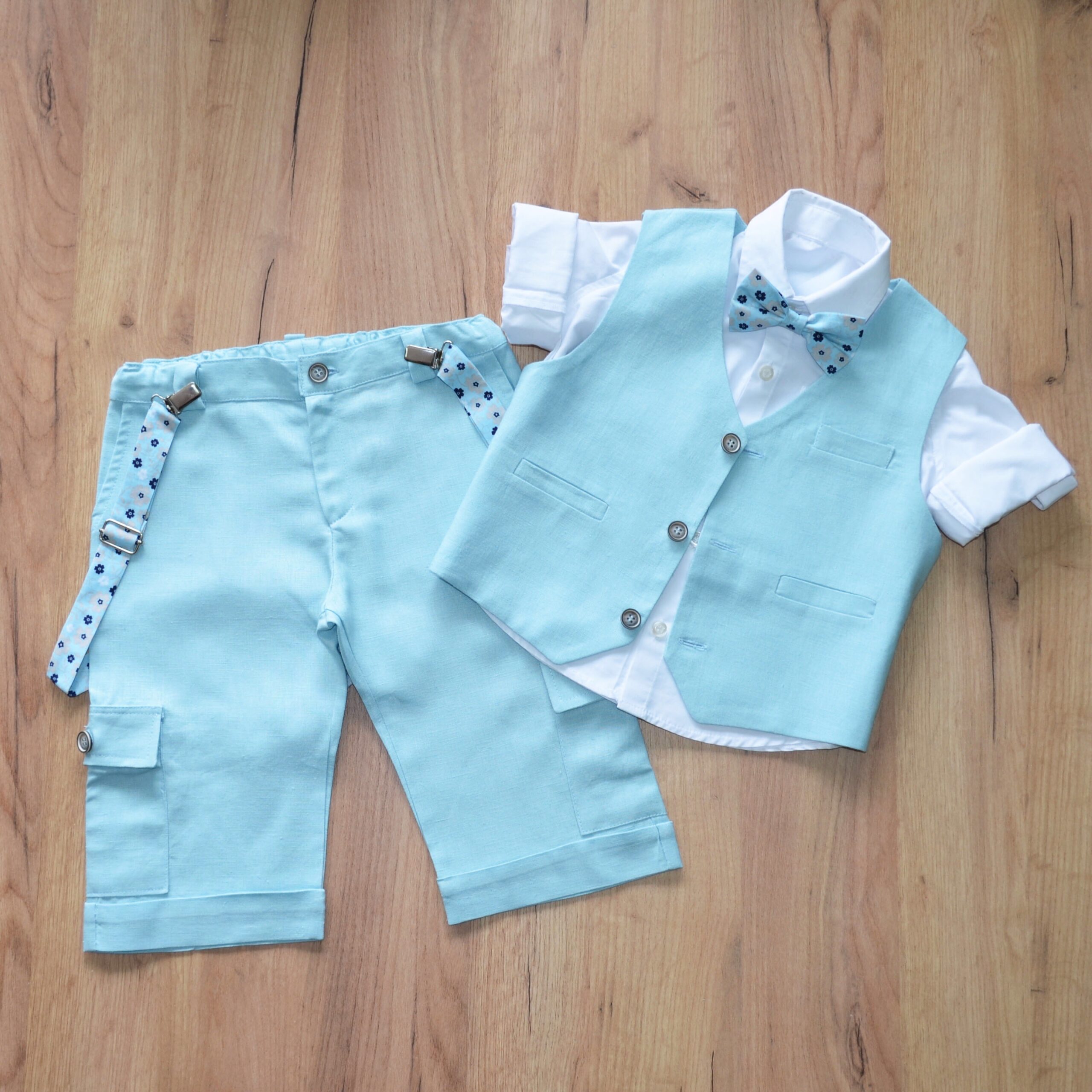 Παιδικό λινό σύνολο ειδικά σχεδιασμένο για μικρούς gentleman που λατρεύουν τις κομψές εμφανίσεις σε κάθε περίσταση. Χειροποίητο ελληνικής κατασκευής. Αποτελείται από λινό γιλέκο και βερμούδα σε σιέλ τόνους, υφασμάτινες floral τιράντες και παπιγιόν στην ίδια απόχρωση.
