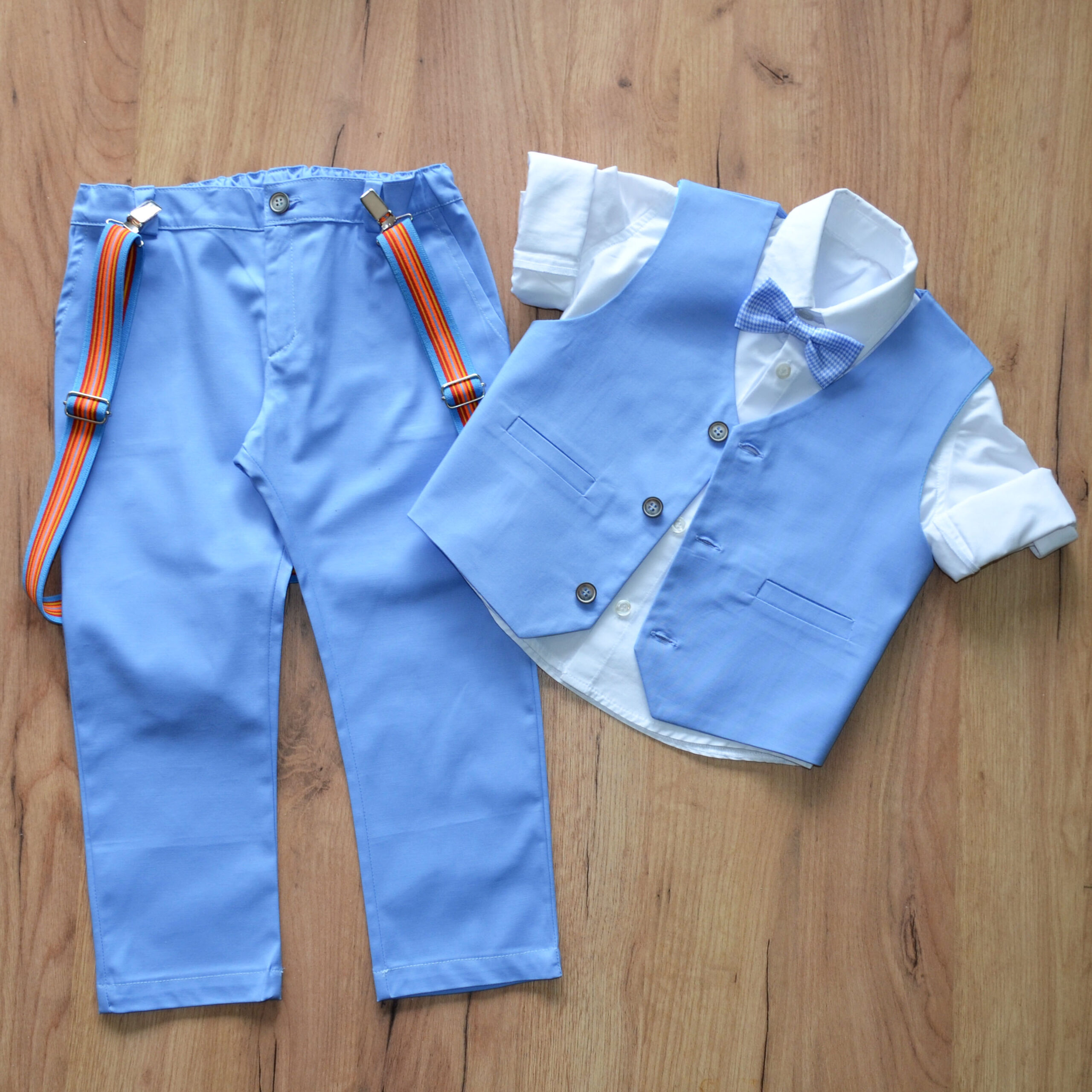 Παιδικό σύνολο 100% βαμβακερό σχεδιασμένο για μικρούς gentleman που λατρεύουν τις ξεχωριστές εμφανίσεις και την κλασική κομψότητα. Αποτελείται από βαμβακερό γιλέκο σε γαλάζια απόχρωση και βαμβακερό παντελόνι. Συνοδεύεται από παπιγιόν και ριγέ τιράντες.