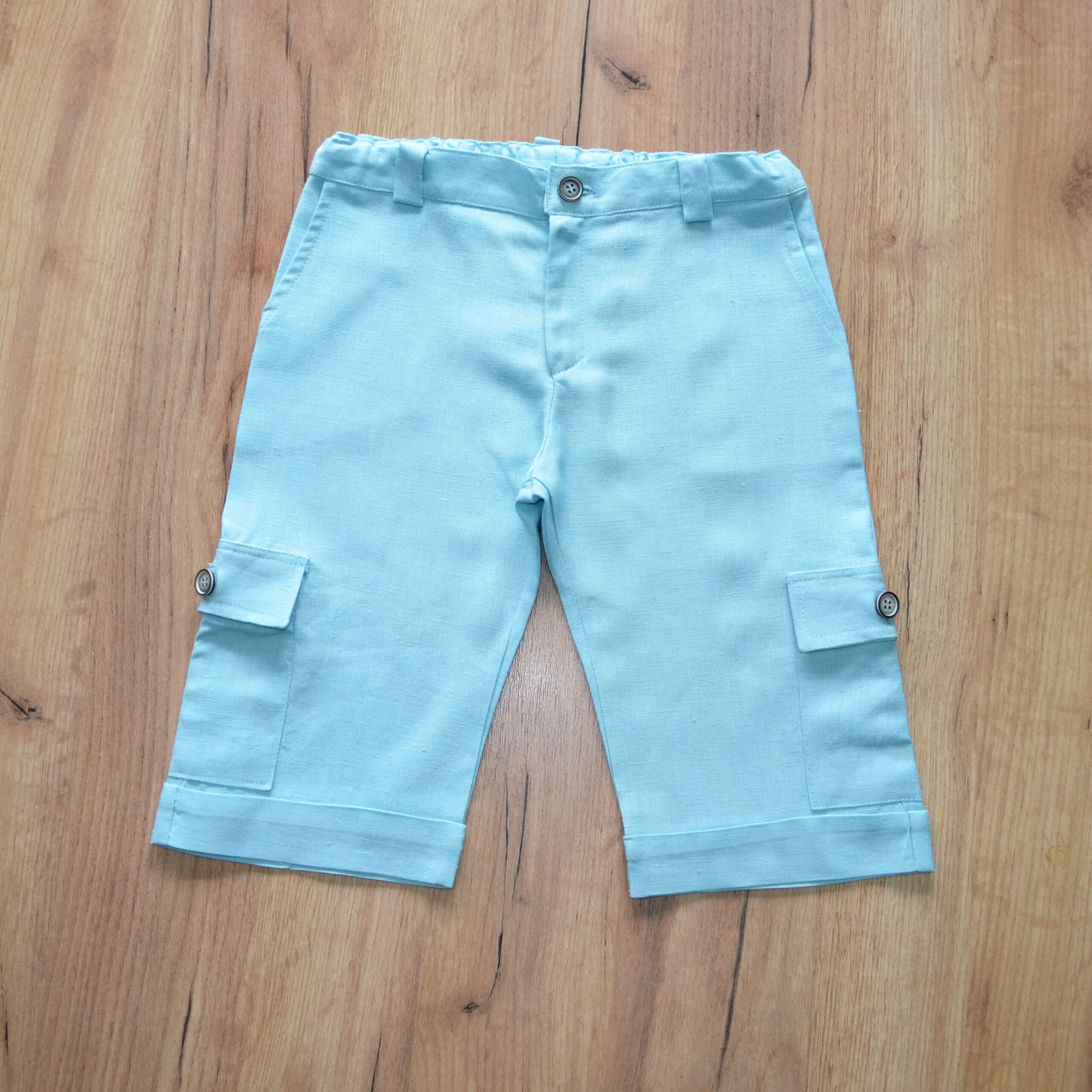 Λινή μονόχρωμη βερμούδα σε σιελ απόχρωση με φερμουάρ και λάστιχο στη μέση που αυξομειώνει. Με εξωτερικές τσέπες και ρεβέρ.